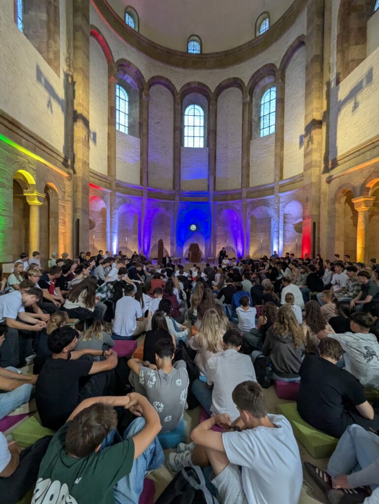 In der Apsis, die ebenfalls beleuchtet war, nahm sich Bischof Wiesemann Zeit für die Fragen der Gruppe. So wurde er nach seinen eigenen Glaubenszweifeln gefragt, warum er Bischof wurde und wie er zu der Frage: Wissenschaft und Glaube stehe.